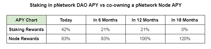 Node Earnings and Projections In order to become a pNetwork Node, 200,000 PNT must be staked in the pNetwork DAO, which earns 42% APY in staking rewards until August 2021. After that point, the APY is cut in half to 21% APY and remains so until the staking program is terminated in August 2022.
